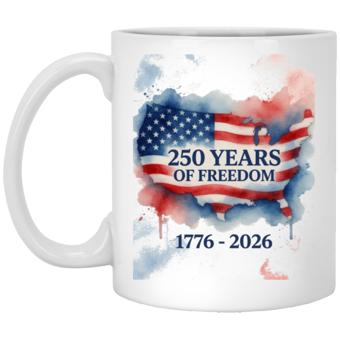 250 Years Of Freedom : Watercolor US Flag Map Design – 11oz White Ceramic Mug