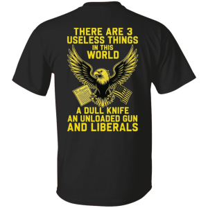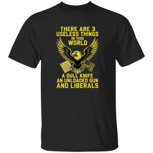 Folks, if you’re fed up with the spineless socialist snowflakes who whine about everything American while trying to shred our Second Amendment rights and drown us in Big Government nonsense, then this bold double sided t-shirt from with blazing yellow lettering is your battle armor screaming “There Are 3 Useless Things In This World: A Dull Knife, An Unloaded Gun, And Liberals” around a fierce eagle clutching the Constitution and Old Glory. This ain’t some weak-kneed liberal apology wear; it’s a gut-punch declaration that real patriots value sharp tools, loaded firearms for self-defense, and zero tolerance for the anti-American leftists who want to disarm you, tax you blind, and turn our Republic into a nanny-state hellhole. Slap this on at the range, the rally, or the grocery store, watch heads turn and commies squirm, and proudly show the world you’re done compromising with traitors to freedom. Grab yours now before the woke mob tries to cancel it, because damn it, true conservatives fight back!