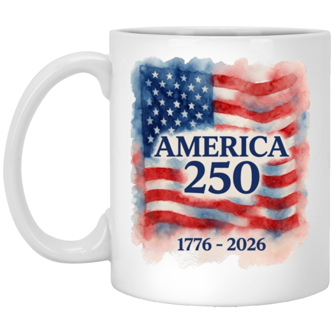 America 250 1776-2026 : Watercolor American Flag Design – 11oz White Ceramic Mug