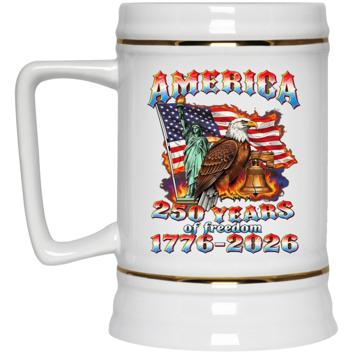 America : 250 years of Freedom – Flag/liberty/Eagle/ Bell Double Sided Design – Ceramic Beer Stein 22oz.