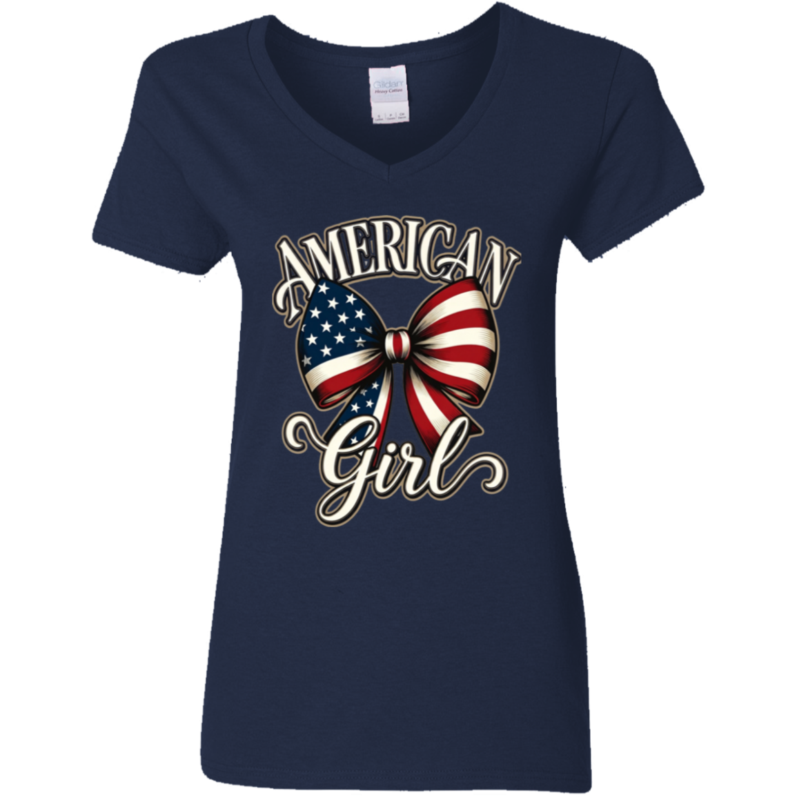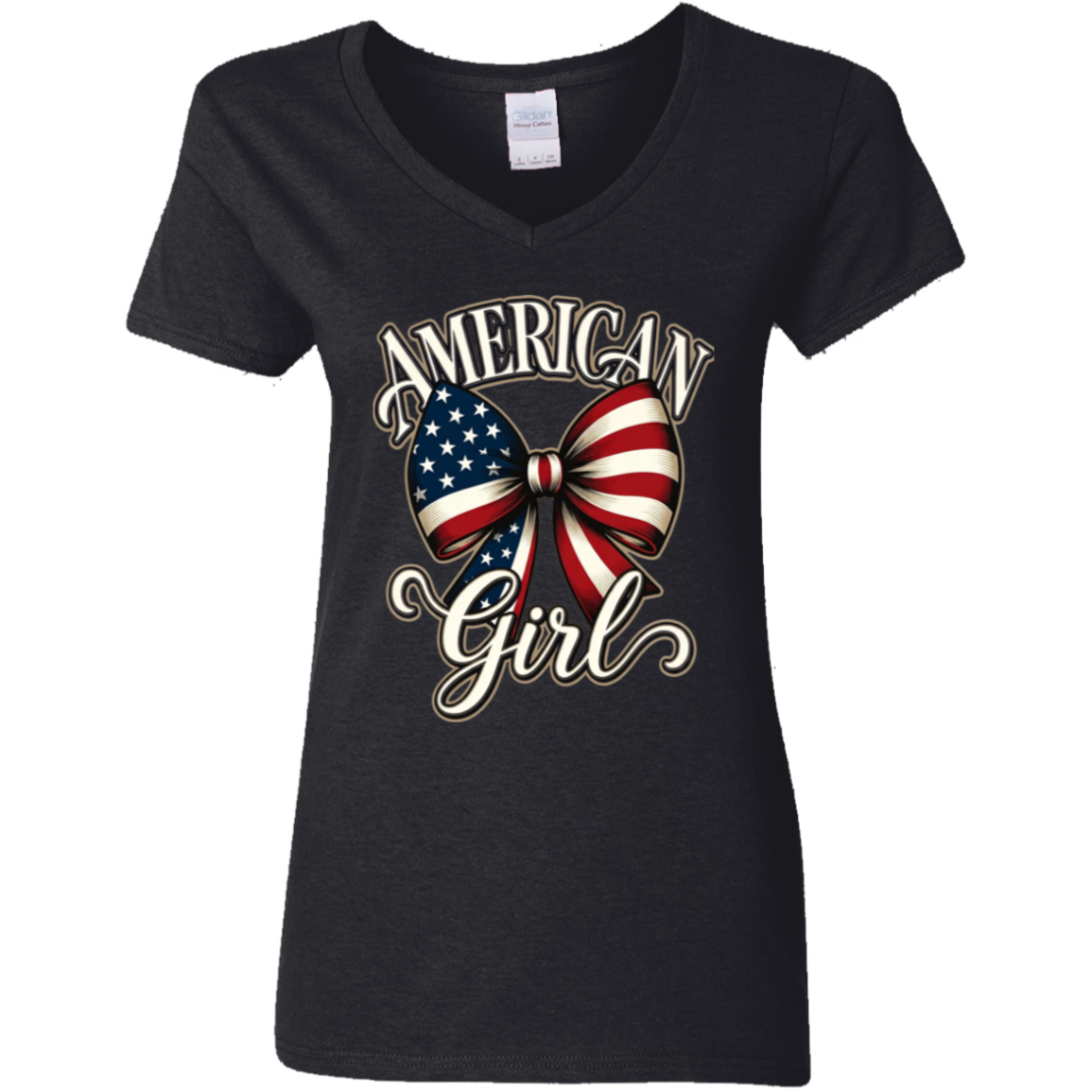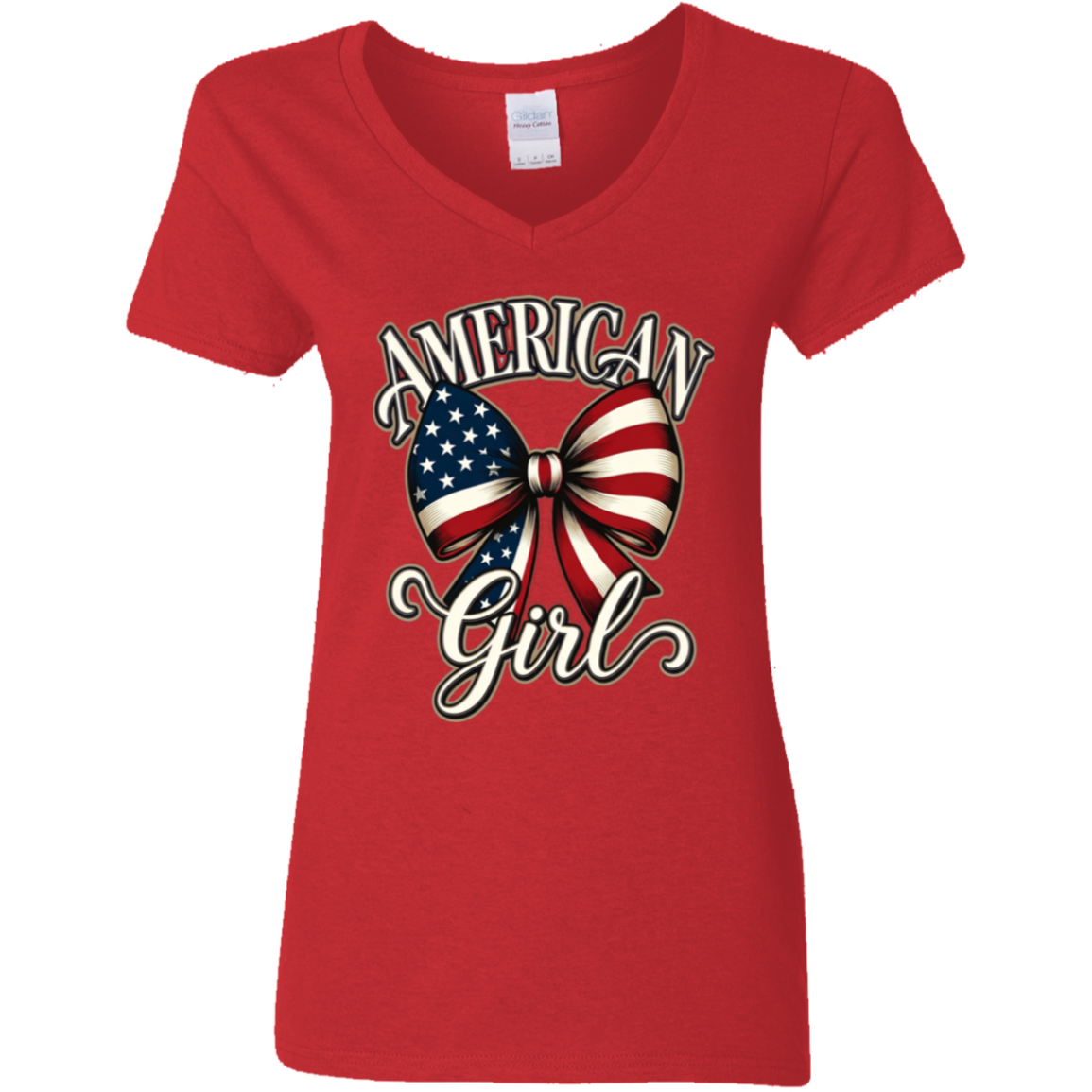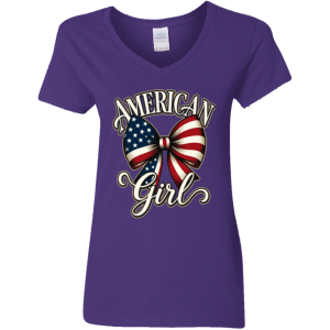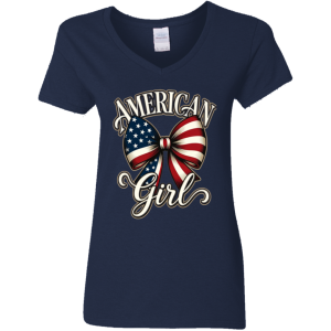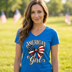 Celebrate your American spirit in style with this beautiful patriotic V-neck tee. Featuring a stunning watercolor-style American flag bow with elegant script lettering that reads **“AMERICAN Girl”**, this design is both feminine and proudly patriotic.