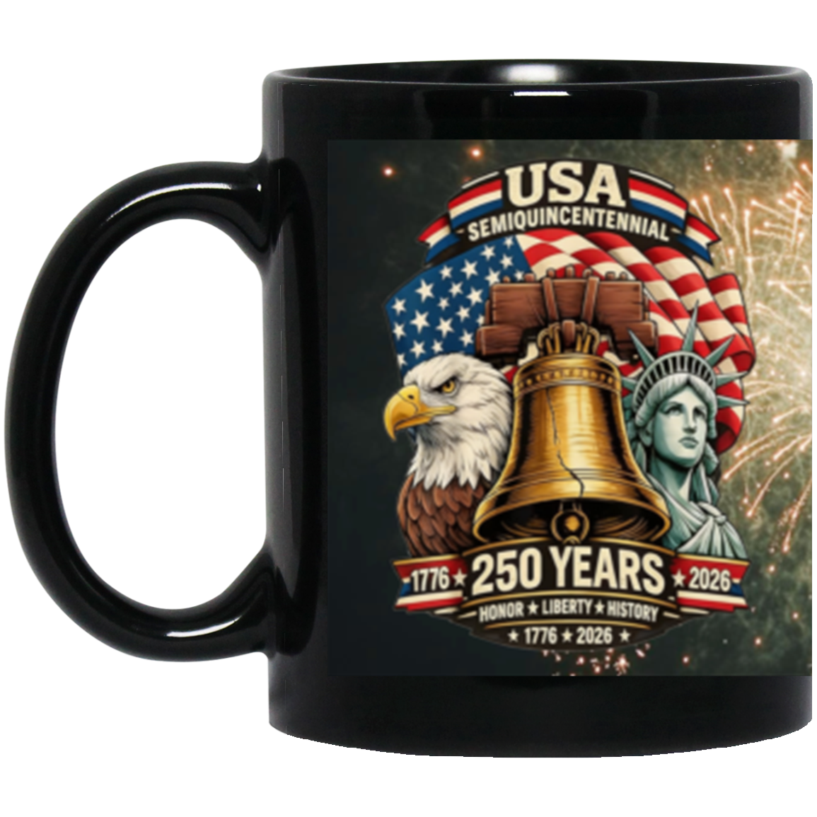Semiquincentential : Flag/Eagle/Bell/Liberty Full Wrap Design – 11oz Black Mug